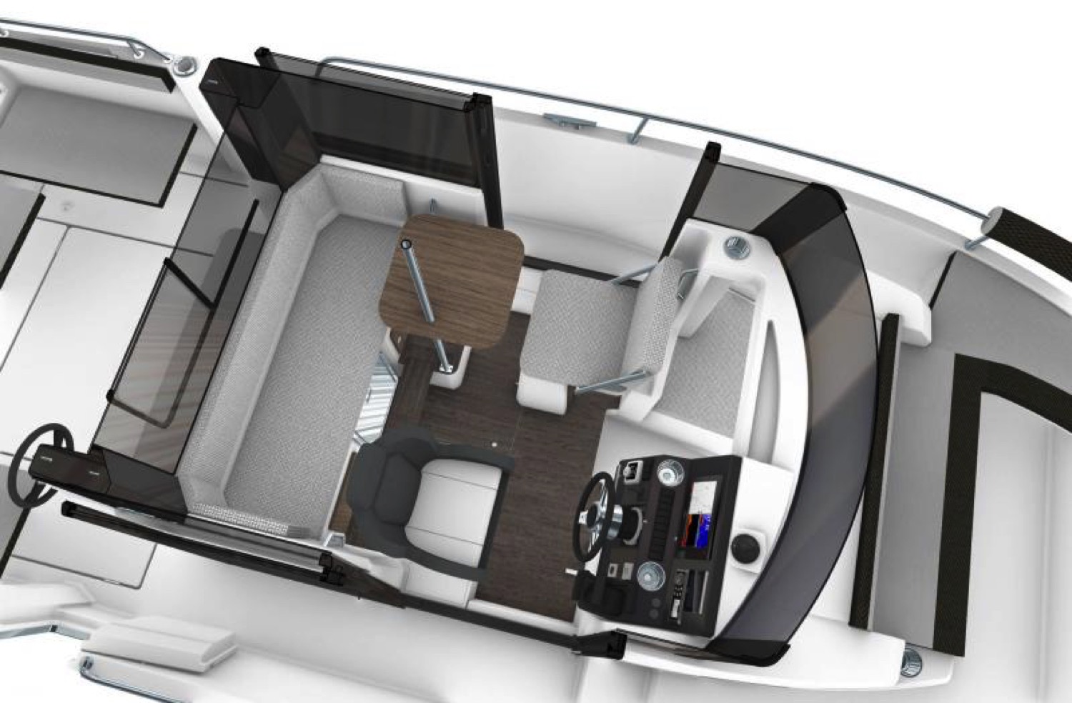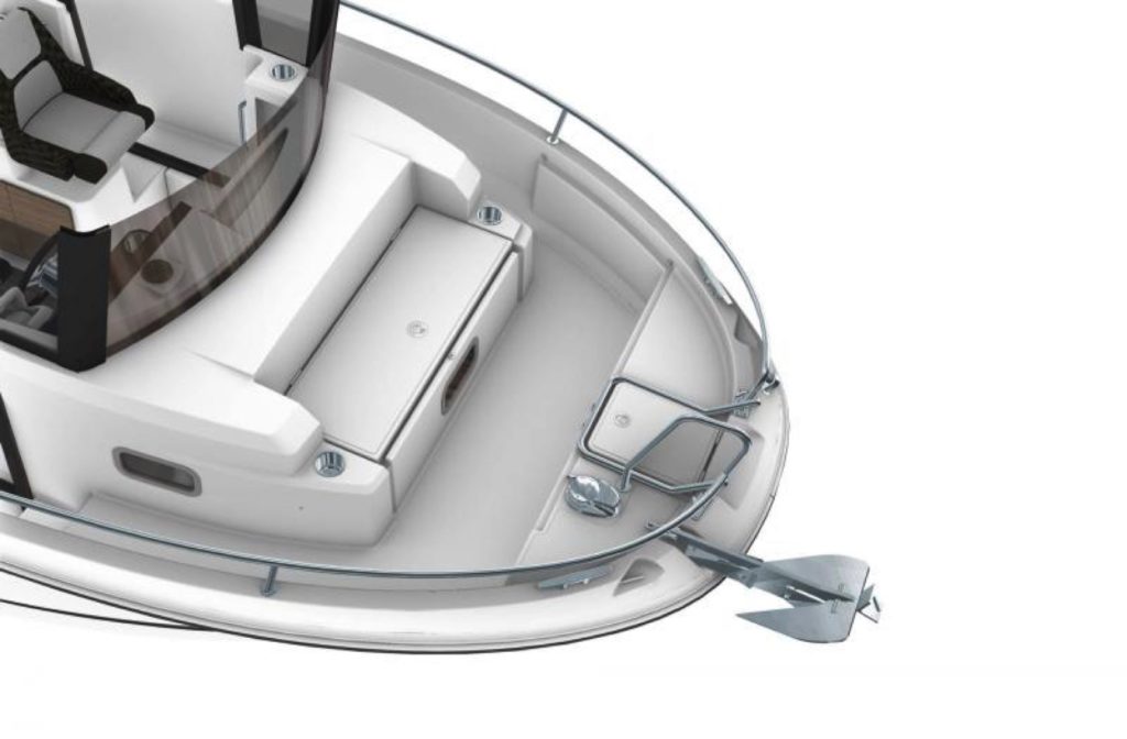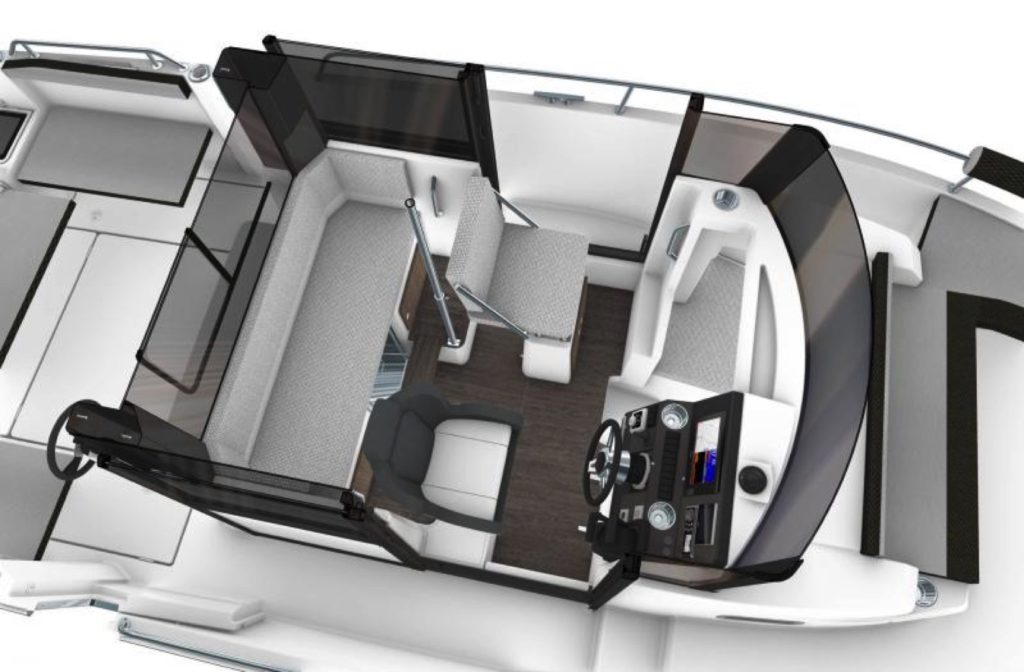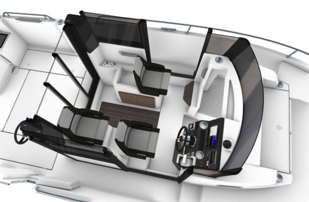Le cockpit arrière vaste et dégagé dispose d’un superbe carré, complètement convertible en fonction des besoins. Le cockpit avant offre un niveau de confort jamais vu sur ce type de bateaux puisque ce vaste espace, sécurisant pour la pêche, peut se transformer tour à tour en un salon avant familial ou en bain de soleil.