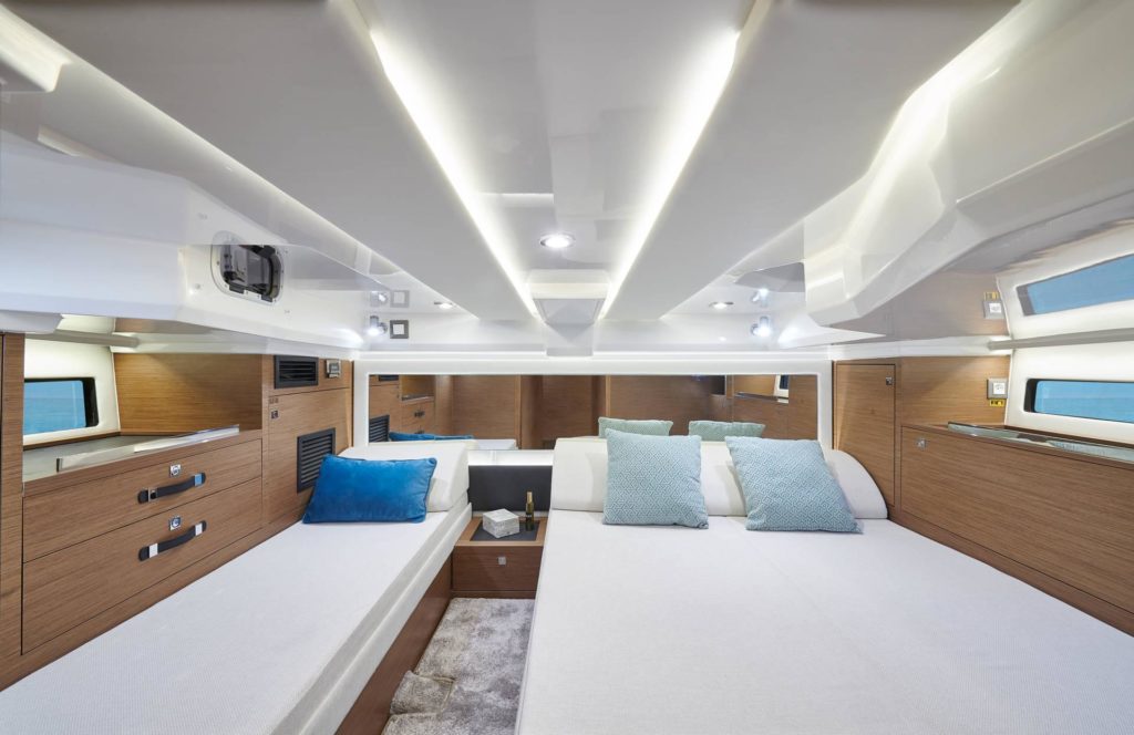 Le luxe de l’espace et les matériaux employés magnifient l’esprit Cap Camarat. La cabine arrière « full beam » avec son lit « king size », comme l’est également l’espace douche séparé participent à ce confort hors norme. Enfin, les larges fenêtres sur la mer ouvrent largement l’espace sur l’extérieur.