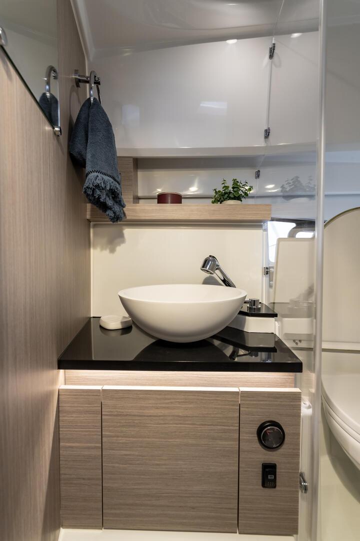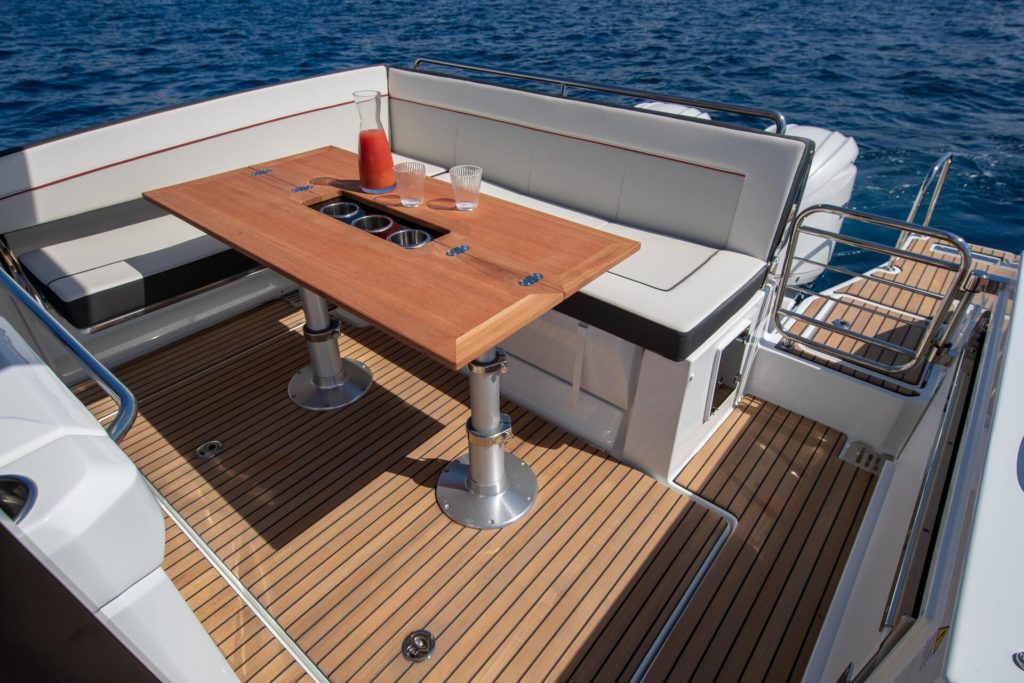 À l’avant, le pont offre un véritable cockpit supplémentaire où l’on peut s’asseoir, siroter un verre dans une chaise longue ou ajouter un module pour former un bain de soleil. À la fin de la journée, une cuisine extérieure comportant grill et réfrigérateur insérés dans un leaning post optionnel, permet de préparer un bon repas face au soleil couchant avant de s’offrir une nuit en mer, dans les deux couchages doubles, installés dans de superbes cabines séparées, accueillantes et lumineuses.