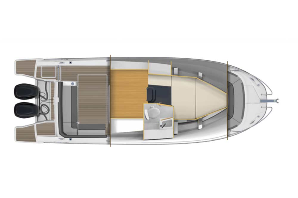 La vie à bord du Jeanneau Cap Camarat 9.0 CC Série 3 est exceptionnelle. Pour la première fois sur un center console de cette dimension, on dispose d’un lit double central et d’un compartiment toilettes/ douche indépendant. Cette proposition de couchage double avec une salle d’eau fermée est unique ! Elle offre des possibilités de navigation sans limites en permettant de prolonger des mouillages de rêve par une nuit à bord !