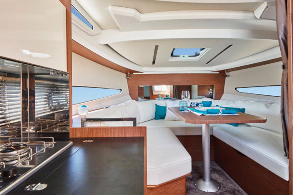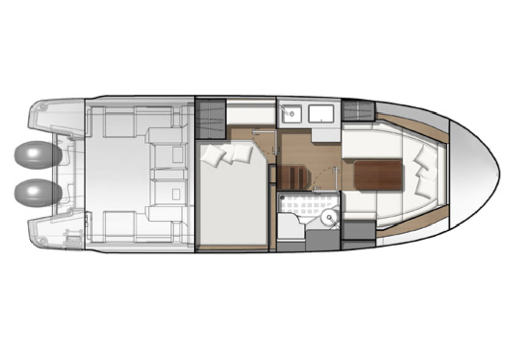 Looké, racé, le Jeanneau Leader 30 hors-bord affiche un design sportif et élégant. Ultra-moderne, ce modèle offre des performances et une tenue en mer de haut niveau. Le Dayboat Jeanneau Leader 30 cumule les avantages d’une motorisation hors-bord. Les coûts sont diminués grâce à un rendement amélioré et à un entretien facilité. Avec son aménagement étudié, pensé et designé pour les besoins de la petite croisière, le Jeanneau Leader 30 hors-bord mêle astucieusement luminosité, confort et plaisirs de la mer. Le modèle présente des aménagements conçus pour offrir une vie à bord extraordinaire. Ses longs plexis continus le long de la coque et sa large plateforme allongent sa silhouette. A l’intérieur, le Jeanneau Leader 30 hors-bord bénéficie d’un gain de place notable grâce à l’espace moteur. Comme tout Leader, il propose un espace hyper lumineux et élégant, des finitions de haut standing, ainsi qu’un ensemble complet : carré transformable en couchage double, cuisine et salle d’eau.