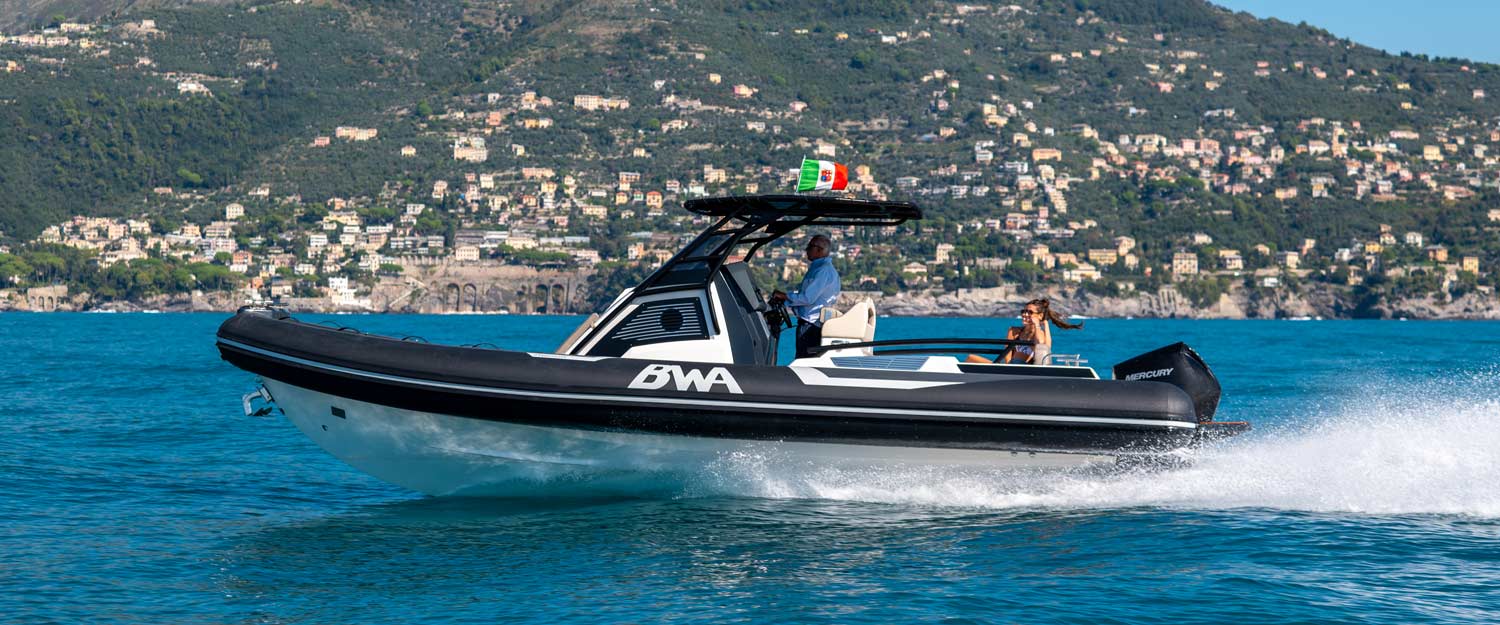 BWA 30 Premium allie sportivité et confort. Le semi-rigide idéal pour les petites croisières en couple ou les journées en famille. Moderne et dynamique. Style recherché