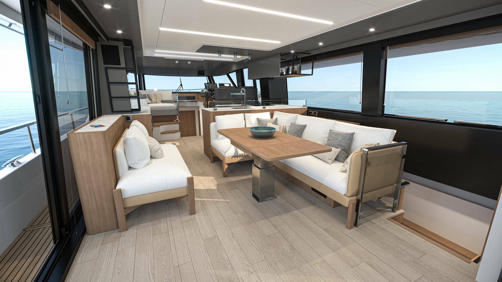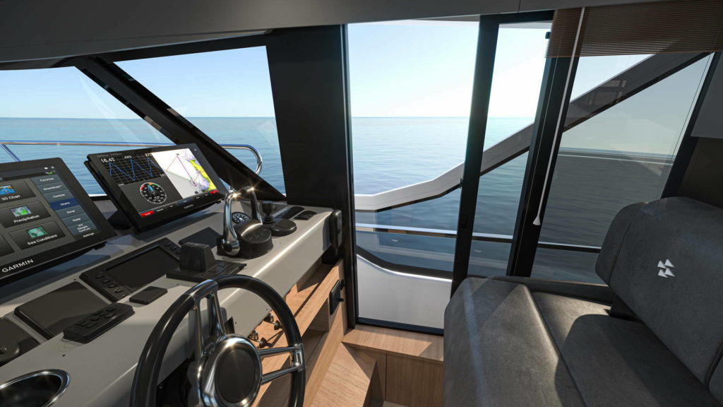 Conçue pour les croisières douces et harmonieuses, sa conception crée une connexion sans limite avec la mer. Totalement ouvert, l’infinity cockpit offre une vue imprenable sur l’océan et communique aisément avec le salon par une large baie électrique.